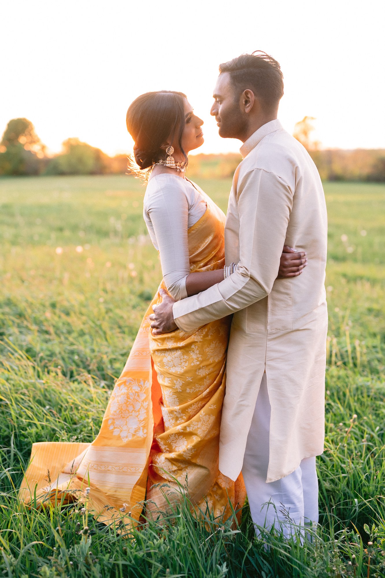 Prethila’s marigold and silk sari underpins the elegant vibe of this Engagement Shoot near Toronto.